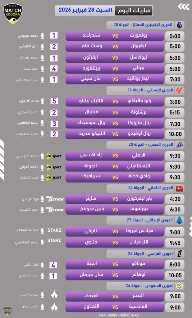 ⚡ نقدم ترتيبًا يوميًا منسقًا وسهل المتابعة لمباريات الدوري الإنجليزي، الإسباني، الإيطالي، الفرنسي، الألماني، والمصري